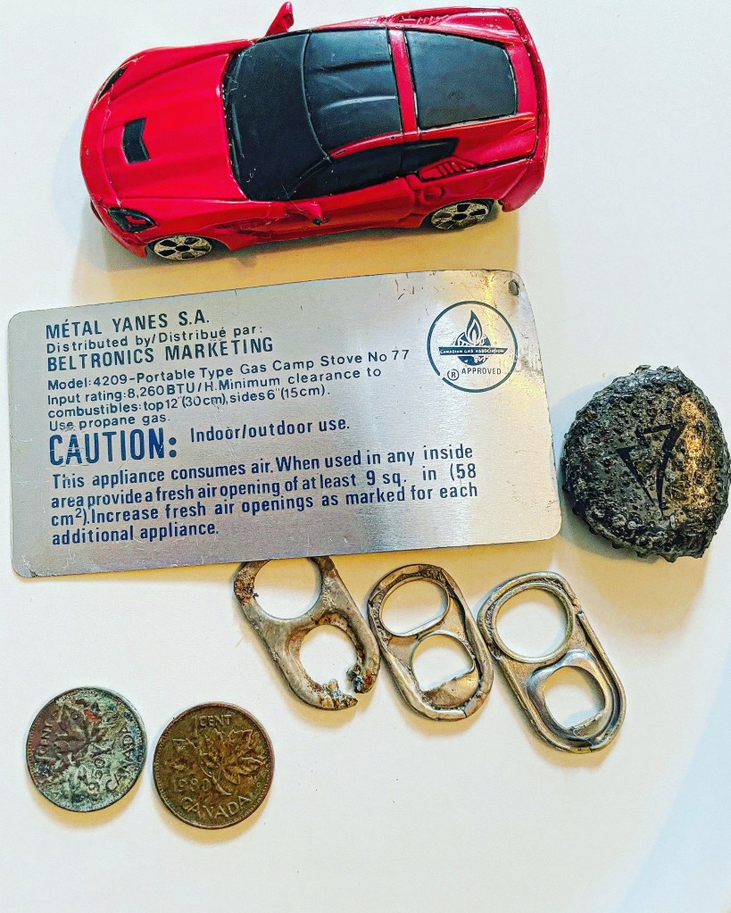 I don’t remember finding much at all other than the regular pull tab/bottle cap but only a couple of those, usually beaches are rotted with those, and a matchbox toy car, a couple pieces of wire , tent pegs are of course all over this beach lol, that was it. no nails, bolts, syringes or metal roof shingles lol ( you’d be surprised what you find at a beach lol) nope I think this beach was fairly clean. And really clean for the size of it.