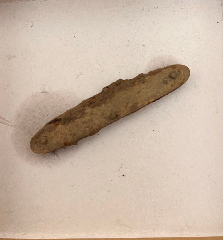 Suddenly, a loud piercing sound echoed in my ear indicating of another item covered by the earth beneath my feet. As I carefully dig so as to try and not hit the item as I dug it out of the ground, a very strange item indeed. at approx 7 to 8” below the surface I pulled out a small yet fairly heavy object and put it into my hand. As I wiped my sweat from my brow I accidentally smudged my glasses and couldn’t see the item too well. So I enlisted the help of my colleague Dave Arnold to help me identify the item.