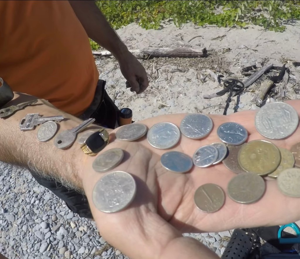 Member Carlos was one of the clear winners of the day. Like I mentioned earlier, he had uncovered that amazing silver bracelet. But he wasn’t done there. He had also found fistfuls of coins I had carefully placed throughout the beach, and he also found the Key that I had painted 3 black dots which in turn earned him the $50 gift certificate.